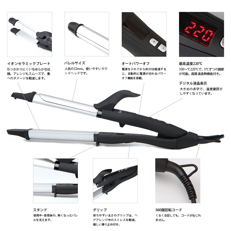 ※変換プラグ、アダプターは別途必要となりますのでご注意ください、 サイズ 本体サイズ:約356mmx39mmx71mm プレートサイズ:直径110mmx直径32mm 機能 完全セパレート仕様、ストレート&カール1タッチ切替可能、オートパワーOFF、定格電圧:AC100〜240V 開閉ロック機能、デジタル表示、360度回転コード プレート温度 120℃〜220℃(ボタン式5℃刻み調節) 重量 約380g(コード込約430g・コード長さ2m) 定格電圧 AC100V〜240V 定格消費電力 67W(定格周波数50/60Hz) バレル素材 アルミニウム、セラミックコーティング、ラバーコーティング 生産 中国